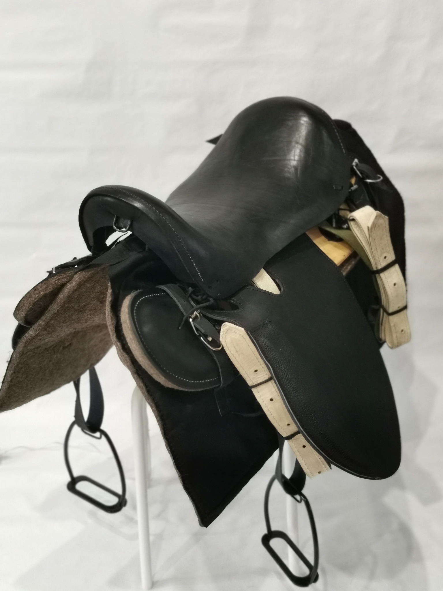 Головка седла состоит из множества частей. Главной частью седла является ленчик, на который крепятся все остальные части седла. Он состоит из двух продольных, изогнутых по форме спины лошади, фанерных полочек (лавок) толщиной 20мм и соединяющих их передней и задней металлических лук. Обе луки соединены живцом - широкой полосой сыромятной кожи толщиной 4-5мм, которая расположена параллельно полкам. К живцу привязаны подушечки из сыромяти набитые войлоком. Поверх живца укладывают крышку седла - сиденье, сделанное методом горячей формовки из прочной, цельной шорно-седельной кожи толщиной 4мм. К полкам ленчика с нижней стороны пристегиваются лыжи войлочные, изготовленные из двух слоев войлока потникового толщиной 7-8мм и кожи. Лопухи (Крылья) седла изготовлены из шорно-седельной кожи толщиной 3,5-4мм .